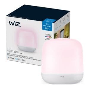 El diseño redondeado simple de la lámpara de mesa WiZ Hero te permite llevar una luz inteligente y colorida a cualquier rincón de tu hogar. Úsala con la aplicación WiZ o con tu voz para atenuar las luces e iluminar o usa los modos de iluminación prestablecidos en configuraciones WIFI.